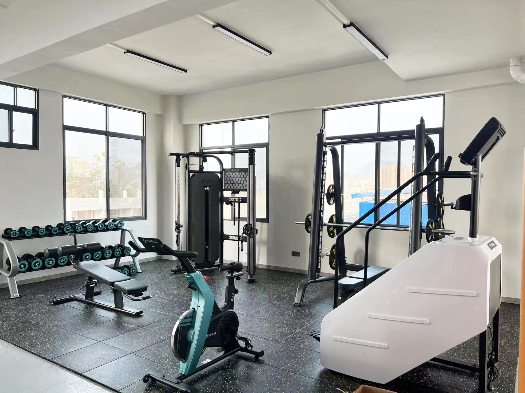 力量器械配置了YABO.COM可调式双滑轮多功能训练器(小飞鸟)SH-G6820、史密斯机训练架SH-G6853、腹肌练习椅SH-G6879 、康健10付哑铃套组,依据锻炼方式不同,能够满足日常多肌群训练(胸、肩、背、腿),让企事业职工在有限的器材里能够得到全方位锻炼身体肌肉。让职工身体更健硕,在工作中释放激情活力,打造完美职场形象。在运动过程中增进职工之间的情感交流,促进各部门紧密融合,增强职工归属感,增强企事业的凝聚力。