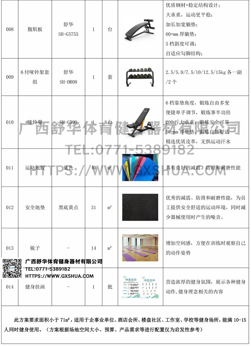 此方案要求面积小于71m²,适用于企事业单位、酒店会所、楼盘社区、工作室、学校等健身场所,能满10-15人同时健身使用。(方案根据场地空间大小、预算、产品需求等进行配置仅为启发性参考)